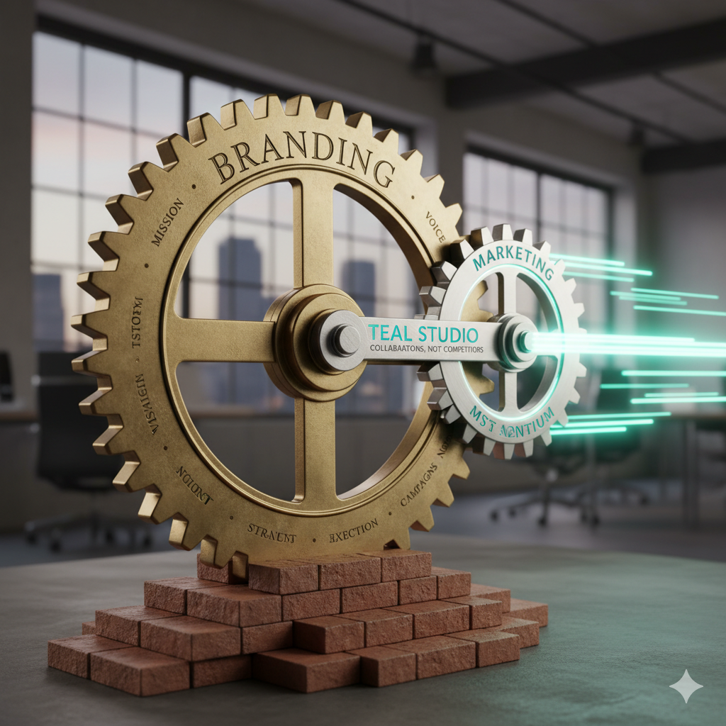 At Teal Studio, we see branding as the foundation and marketing as the engine. Branders define the story: the mission, values, voice, and visual system that guide every creative choice. Once those assets and guidelines are in place, marketing takes the lead, activating that story through campaigns, strategy, and execution.